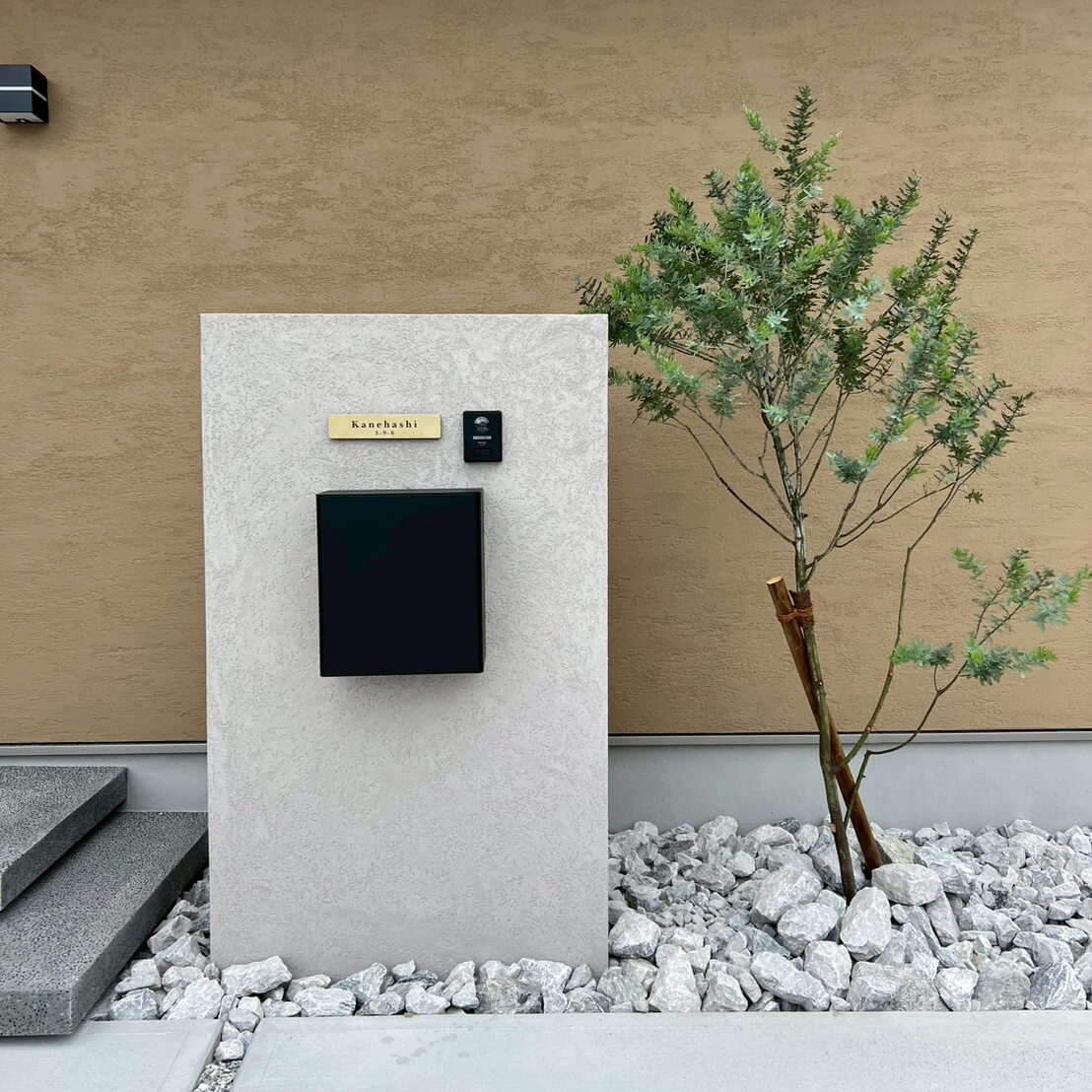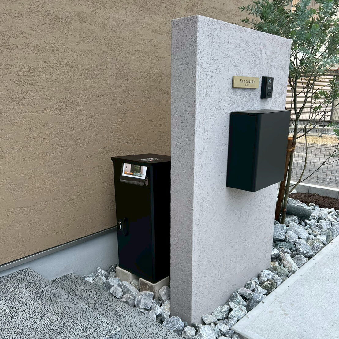 表札やポストをスッキリと収めつつ、裏面には大型の宅配ボックスも無理なく設置できる機能的な設計に。