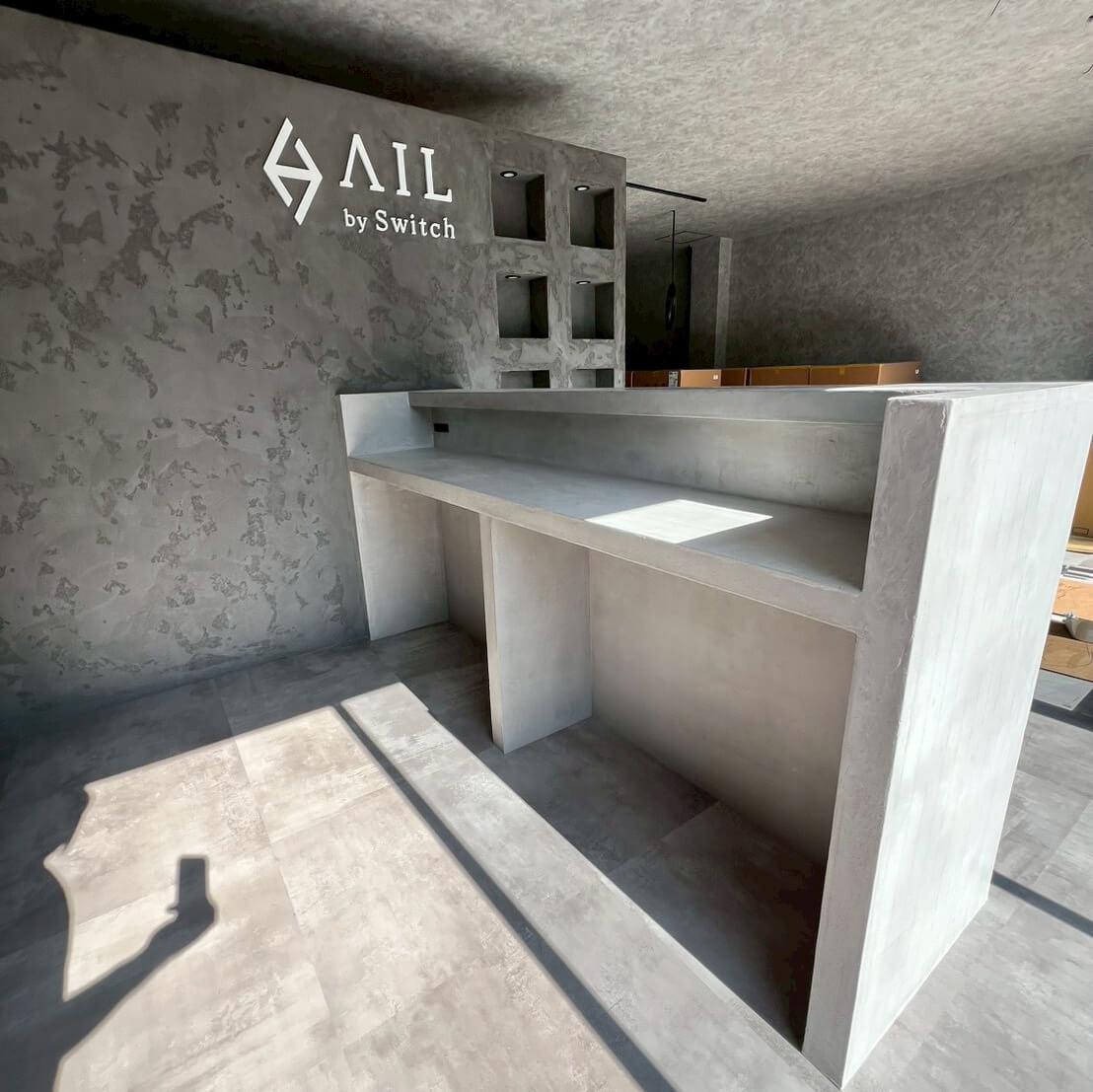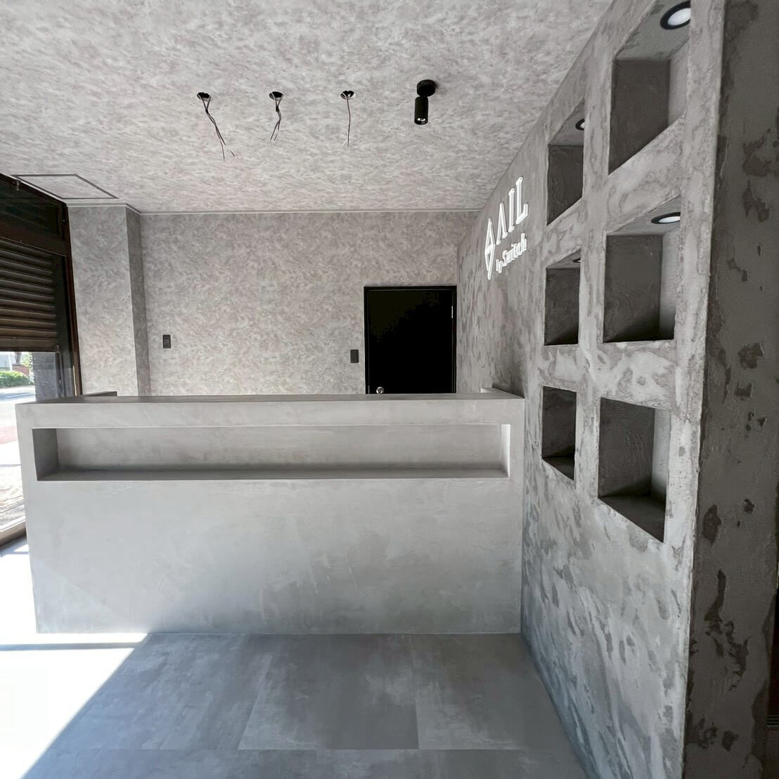 モールテックス調のムラ感ある表情が、洗練された空間デザインの核となり、ブランドの世界観を際立たせます。