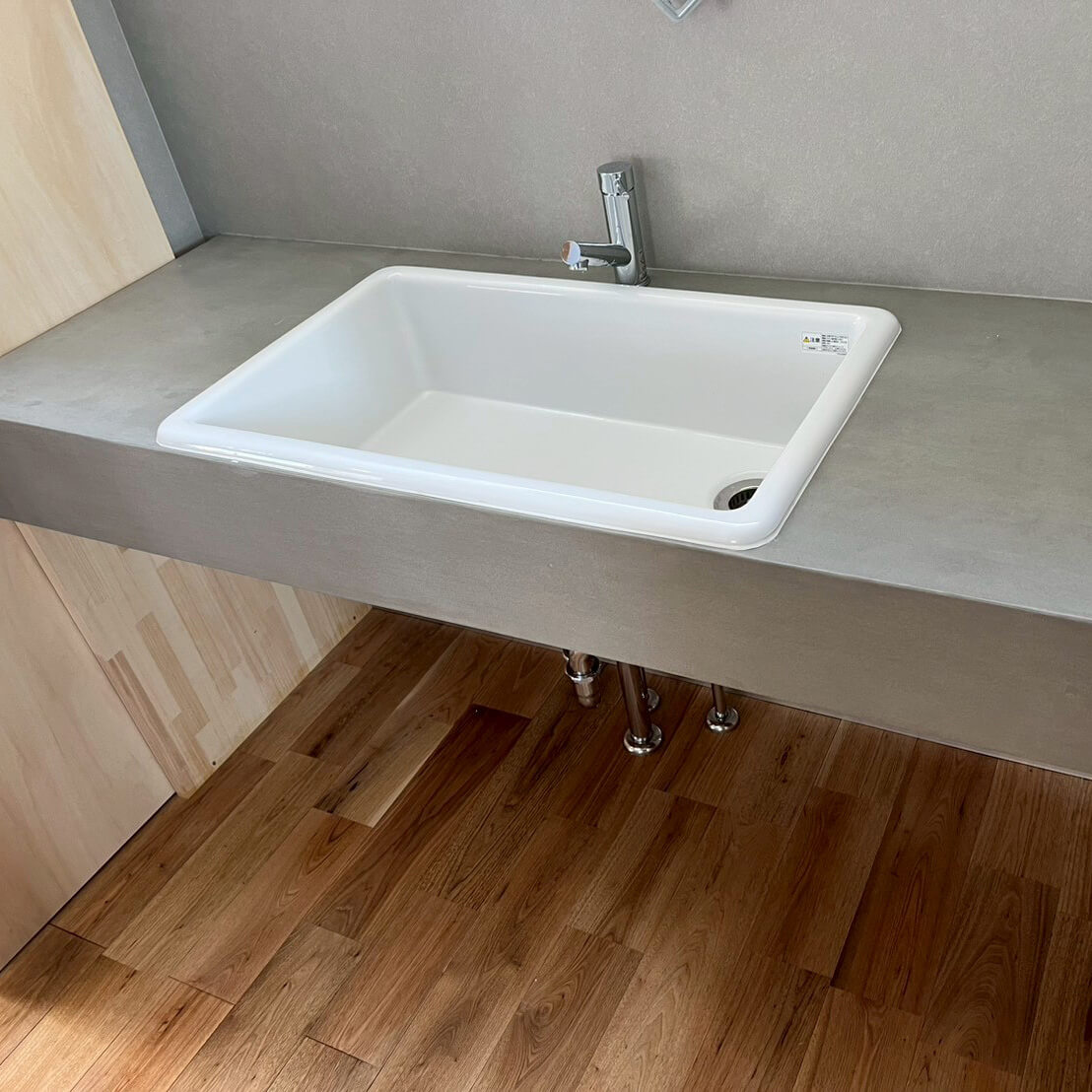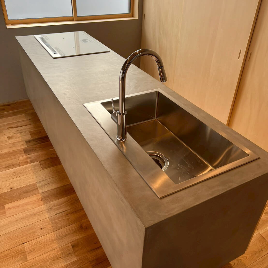 無垢の木目が美しい空間に、コンクリート調のソリッドな質感が映えるキッチンと洗面台。